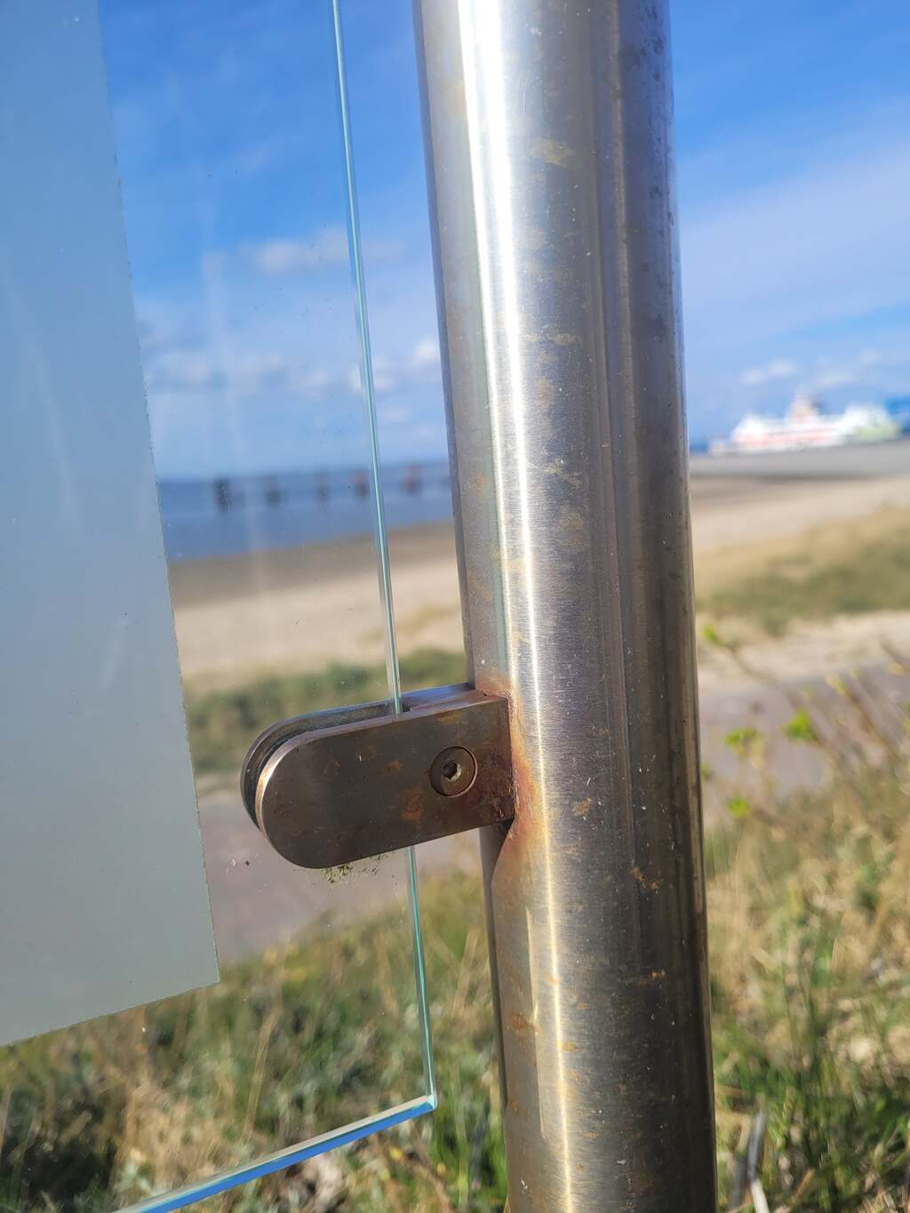 Schild eines Immobilienmaklers am Strand: ein gewöhnlicher rostfreier Stahl hält der aggressiven Seeatmosphäre nicht stand. Die Halterung des Schildes verlor sein edles Aussehen.