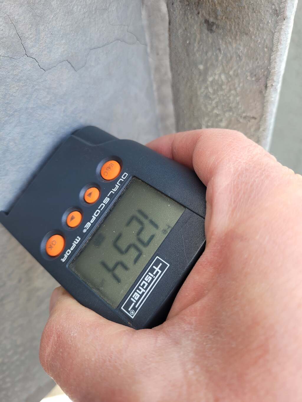 Vor-Ort Messung der Zink Schichtstärke auf einer Stahlkonstruktion: mit 1,25 mm ist die Verzinkung viel zu dick und blättert daher ab. Ursache ist eine für den Verzinkungsprozess ungünstige Zusammensetzung des Stahls.