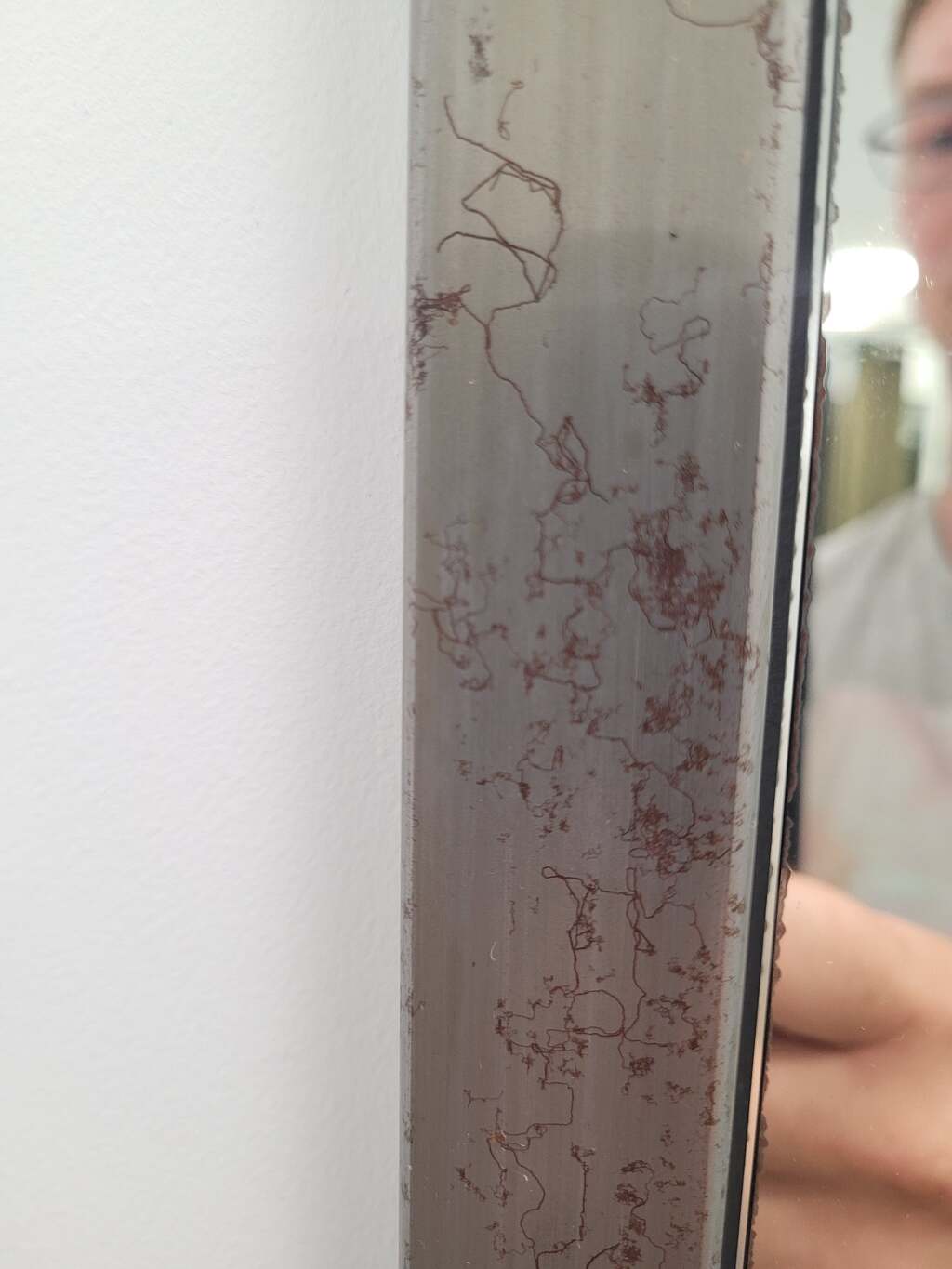 Das Bild zeigt eine Spiegelumrahmung in einem Geschäft. Der Rahmen besteht aus Stahl, versehen mit einem Klarlack. Unterhalb des Lackes liegt Filiformkorrosion vor, die Ausbreitung der Korrosion und somit das Vorliegen von Korrosionsprodukten ist fadenförmig unterhalb des Lackes. Ob dies in diesem Fall ein Schaden ist oder Design ist nicht bekannt.